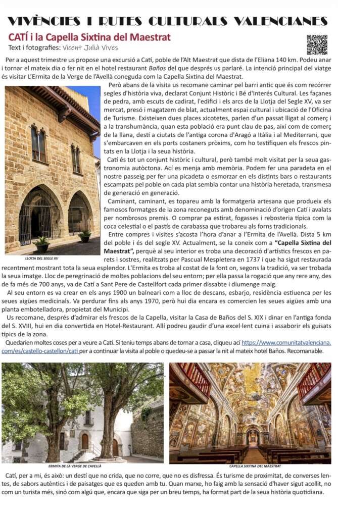 Per a aquest trimestre us propose una excursió a Catí, poble de l’Alt Maestrat que dista de l’Eliana 140 km. Podeu anar i tornar el mateix dia o fer nit en el hotel restaurant Baños del que després us parlaré. La intenció principal del viatge és visitar L’Ermita de la Verge de l’Avellà coneguda com la Capella Sixtina del Maestrat.